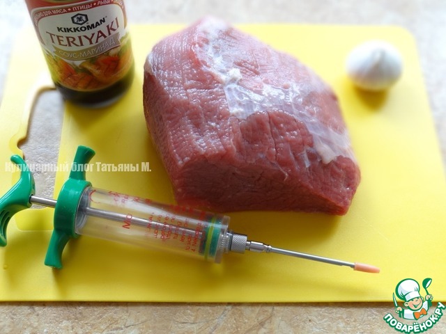 С помощью маринатора обколоть мясо Терияки со всех сторон, вытекший соус втереть в мясо снаружи;