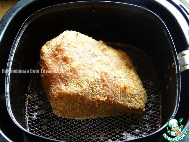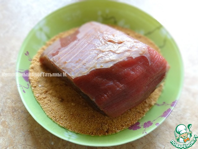 Панировочные сухари слегка подсолить, обвалять в них мясо;
