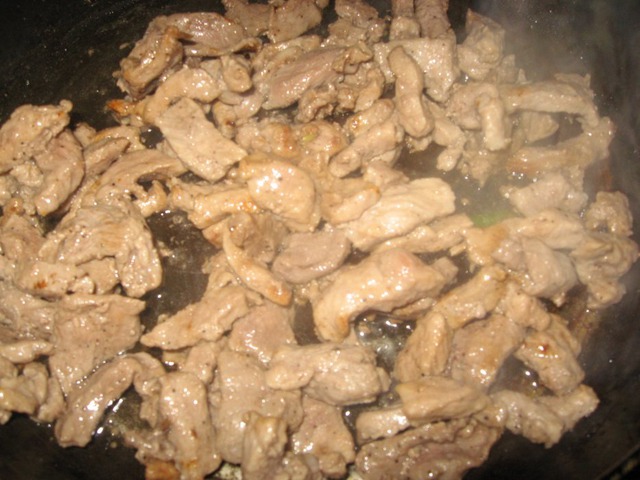 Молодую телятину нарезаем соломкой и маринуем (10 мин) в соевом соусе,добавляя соль и черный молотый перец.После этого начинаем ее обжаривать на хорошо нагретой сковородке.