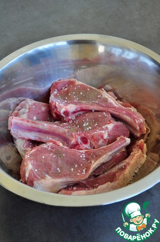 Телятину разрезать по косточке. Выложить в глубокую посуду для маринования.