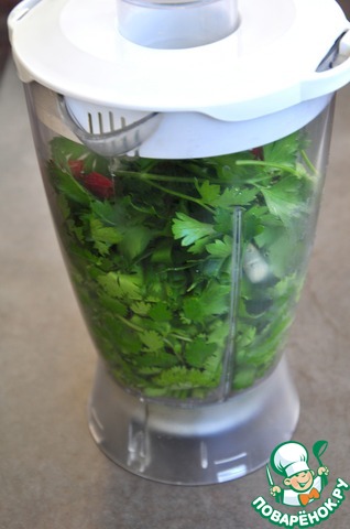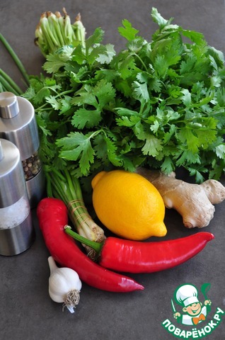 Сложить в блендер кинзу (если не любите, замените на базилик), петрушку, зеленый лук, чеснок, чили перец по вкусу, кусочек имбиря. Подливая понемногу оливковое масло, пюрировать зелень до однородного состояния. Густоту соуса регулируйте по своему вкусу (я люблю густой как песто). При желании, можно потереть для большего аромата цедру половины лимона.