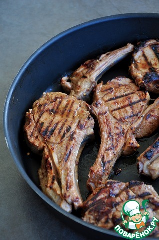 Силиконовой кисточкой снять я мяса зерновую горчицу иначе она будет пригорать при приготовлении. Обжарить каре на сковороде-гриль по 4 минуты с каждой стороны. Переложить в форму для запекания.