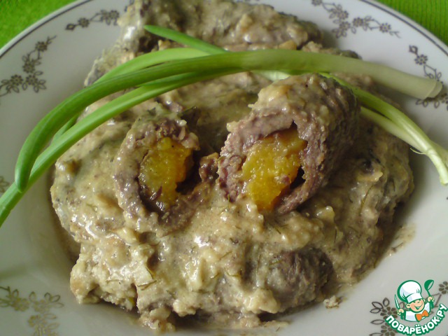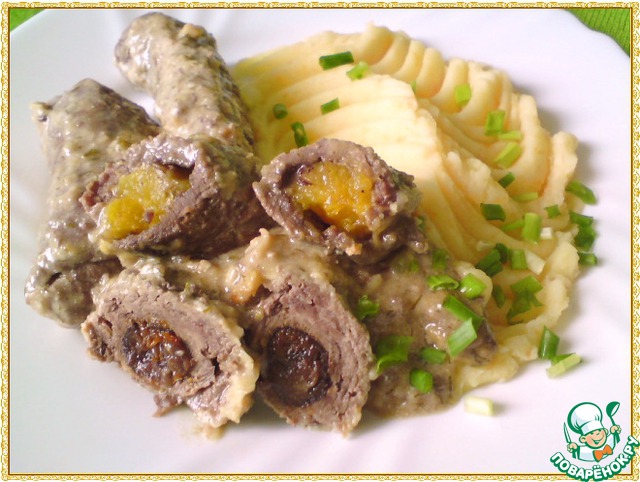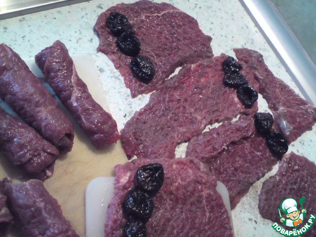 На каждый ломтик мяса класть по 2-4 штучки помытого чернослива к более узкой стороне отбивного, а затем крепко свернуть его в трубочку.