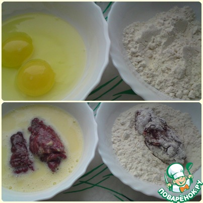 Когда трубочки готовы, подготавливаем две ёмкости. В одну вбиваем яйца, в другую насыпаем муку. Каждую трубочку обмакиваем сначала в яйце, а затем в муке...