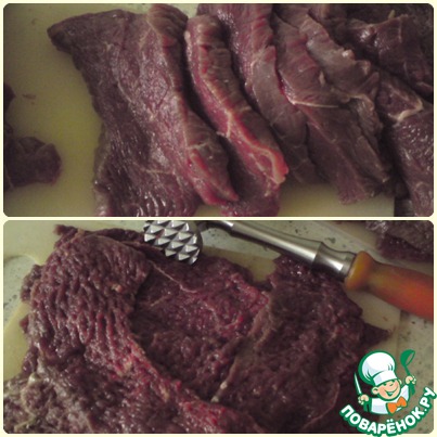 Телятину нарезать пластинами толщиной примерно 1 см, отбить. Я, к сожалению, телятину не смогла приобрести, использовала молодую говядину.