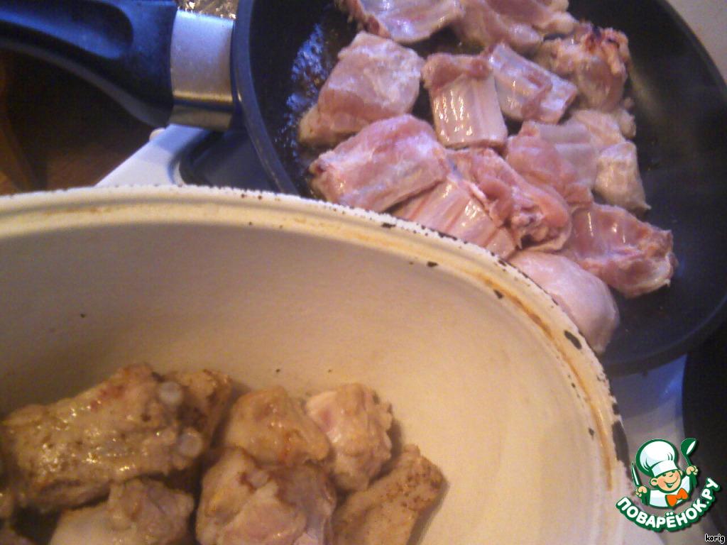 Режем лук мелко. Обжариваем в оставшемся масле после ребрышек. Лук выкладываем к мясу.