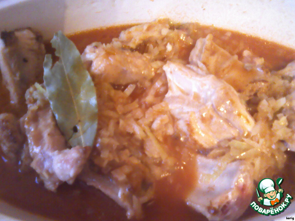 Вылить к ребрышкам, добавить лавровый лист. Тушим , периодически помешивая до полного растворения лука.