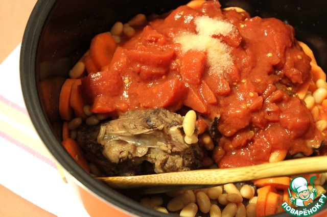 Добавить туда же рубленые томаты в собственном соку, посолить, поперчить по-вкусу. Я еще добавляла щепотку тимьяна и несколько горошин черного горького перца. Налить литр горячей воды. Закрыть крышку мультиварки. Дальше я готовила в режиме мультиповар. Выставила температуру 150 градусов и время - 1 час.