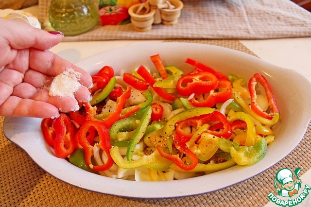 Затем полукольцами болгарский перец, посолить и поперчить.