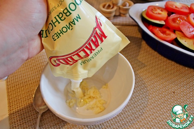 Теперь готовим соус. Для этого надо смешать чеснок через пресс, майонез и 100 мл кипяченной воды.