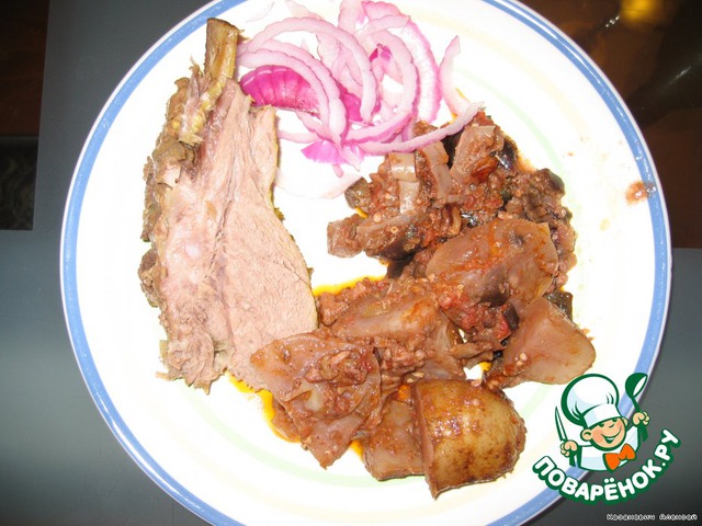 Картофель молодой тушенный с овощами и запеченными ребрами