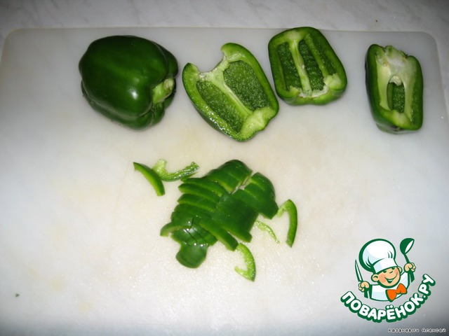 У перца удаляем плодоножку и рубим полукольцами, тушим с луком 5 минут.