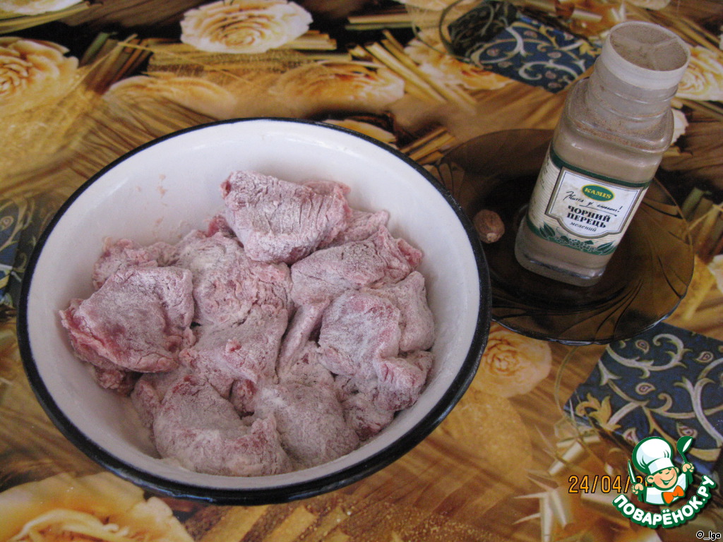 Обвалять кубики мяса в смеси муки, соли, перца и мускатного ореха.