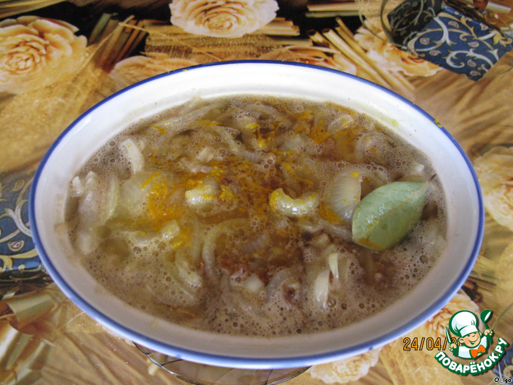 Соединить мясо и лук, добавить апельсиновый сок и цедру, портер и лавровый лист.