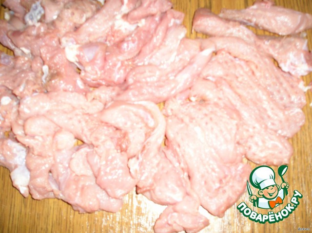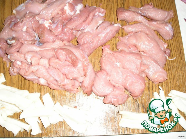 Нарезаем мясо порерёк волокон небольшими кусочками. Сало - маленькими брусочками.