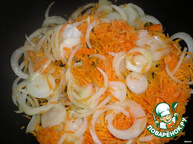 Натираем на крупной тёрке морковь и шинкуем кольцами луковицу.