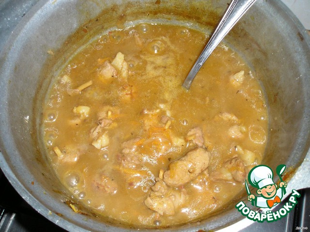 Отправляем к самураям. Заливаем кипятком и тушим минут 10. Если у нас говядина, а не телятина - добавляем 20-30 минут.