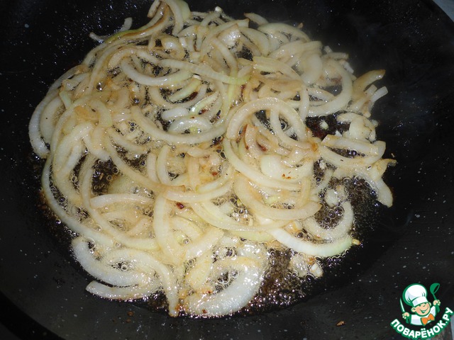 Отправляем лучок в сковороду, где жарилось мяско, добавляем сахар. Томим до мягкости и золотистости.