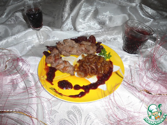 Коса-мясная краса под гранатово-брусничным соусом с карамелизированным луком