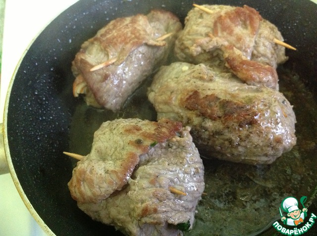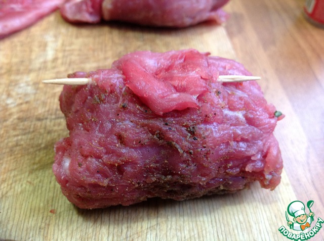 Стейки свернуть конвертиком и защипнуть зубочисткой