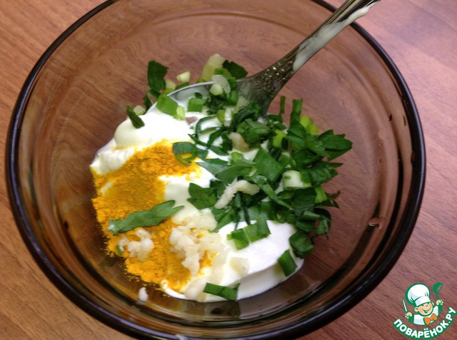 Сметану, шафран, мелко рубленную зелень и чеснок перемешать, и вылить к стейкам с добавлением полстакана кипяченой воды