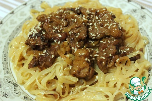 В готовое мясо выложить фунчозу, перемешать. Подавать, посыпав кунжутом. Приятного аппетита!