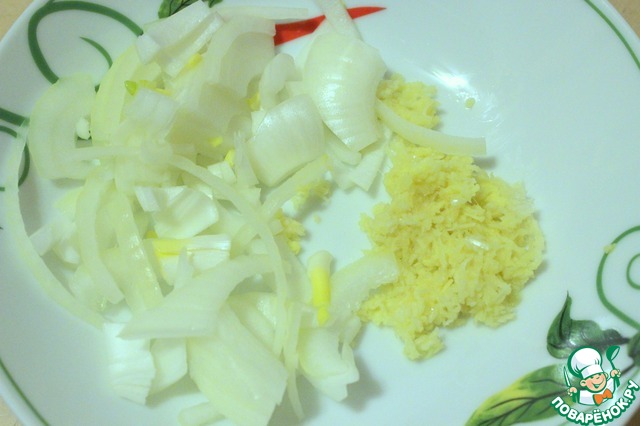 Поместить ее в чашу мультиварки и обжарить на на растительном масле на режиме обжаривание до румяной корочки. Крышку мультиварки не закрывать. Пока обжаривается мясо, натереть на мелкой терке имбирь и чеснок и мелко нарезать лук.