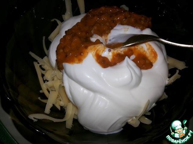 Готовим заливку: смешиваем майонез, тертый сыр, горчицу (у меня с зернышками) и бульон.