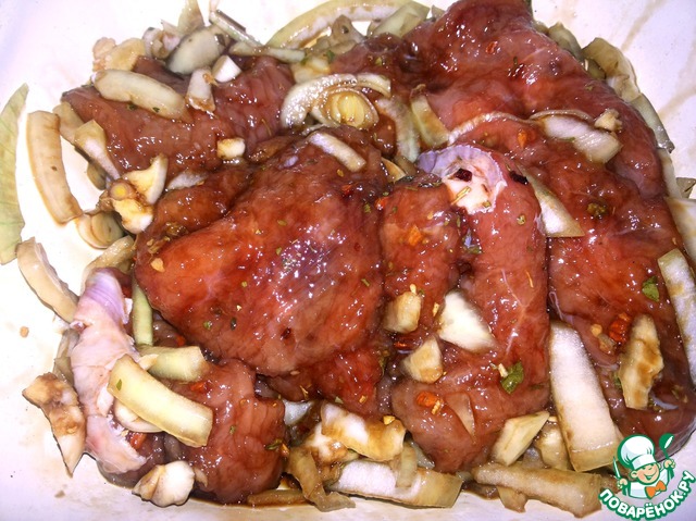 Берем 5 порционных кусков телятины, слегка отбиваем и маринуем в смеси соевого соуса, специй, лука (полукольцами) и чеснока (измельчить), конечно же- чем дольше, тем лучше. Я мариновала сутки.