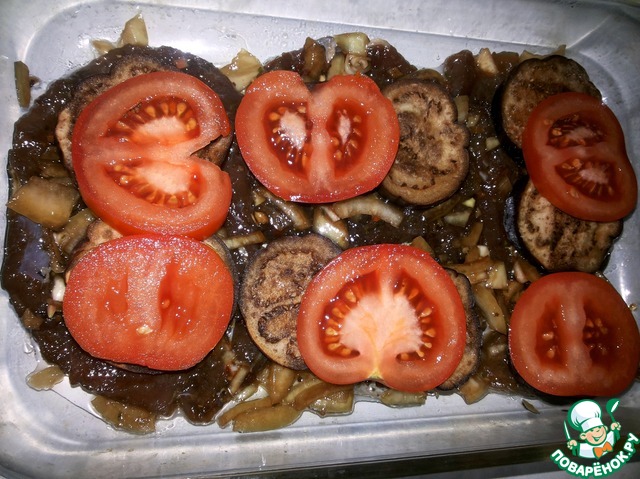 Затем выкладываем мяско в форму для запекания, лучок-чесночок выкладываем сверху, затем кружочки баклажана (можно предварительно обжарить баклажаны, но я этого не делала - так сочнее), кружки помидора.