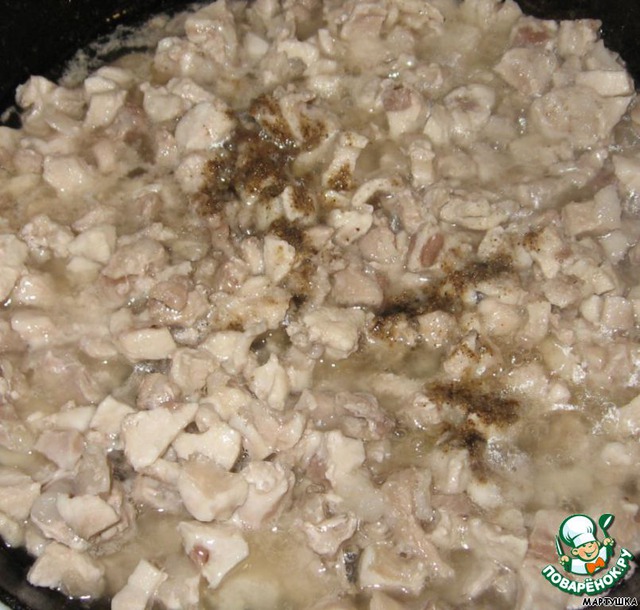 Затем срезанное мясо нарезает на маленькие кусочки.