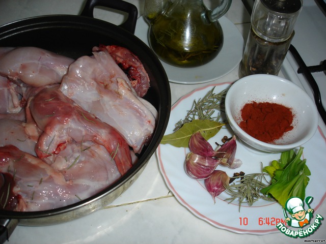Накануне тушку кролика разрезать на порционные куски и замариновать.