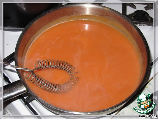 Доливаем воды (примерно литр), комочки чудно разбиваются вот таким венчиком. Добавляем ложку томатной пасты, солим. Томат можно и проигнорировать, если кто не любит.