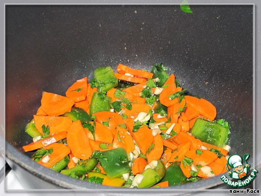 Сливаем воду с кролика, закидываем в кастрюлю перец, чеснок, морковь и петрушку, доливаем оливковое масло и сдабриваем белым перцем. Я раньше не понимала - ну зачем столько видов перца? есть черный молотый и ладно... Как бы не так! Купила розовый перец, зеленый и белый. У каждого свой, неповторимый аромат и вкус. Итак, намололи белого перца. Посолили.