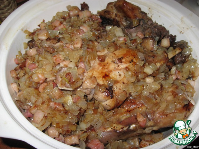 Бекон и очищенный репчатый лук нарезать мелкими кубиками так же обжарить. Куски кролика снова положить в сковороду, полить коньяком и поджечь. Обожженное пламенем мясо положить в гусятницу или форму, в которой будете тушить.