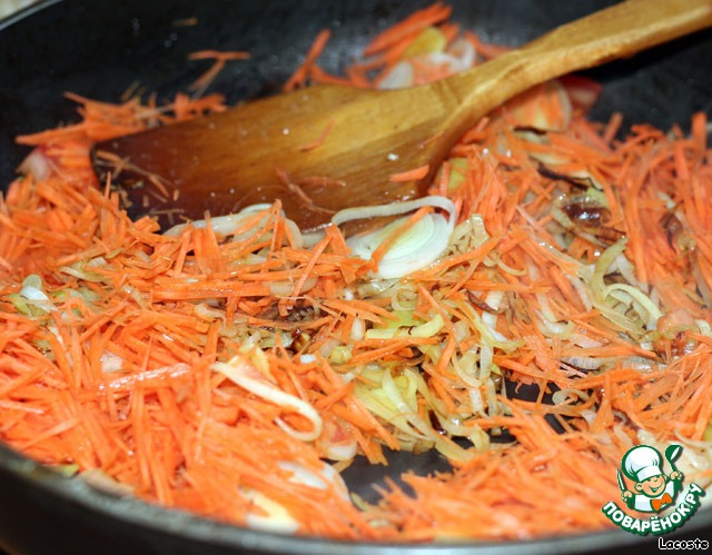 Добавить к луку-порею натертую брусочками морковь и продолжать обжаривать, не забывая помешивать.