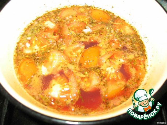 Затем готовим маринад: 1,5 стакана вишневого сока (а его можно заменить сливовым, кстати, говоря) ставим на медленный огонь, добавляем туда 1 куриный кубик, режем один-два свежих помидорчика, три зубчика чеснока, добавляем винного уксуса около 70-100 мл, кладем любимые специи, солим обильно и перчим. перемешиваем и доводим до кипения.