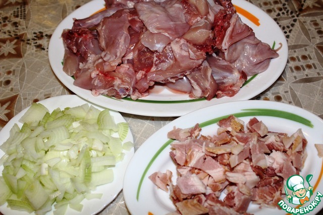 Кролика разрезать на порционные куски, лук и бекон нарезать тонко.