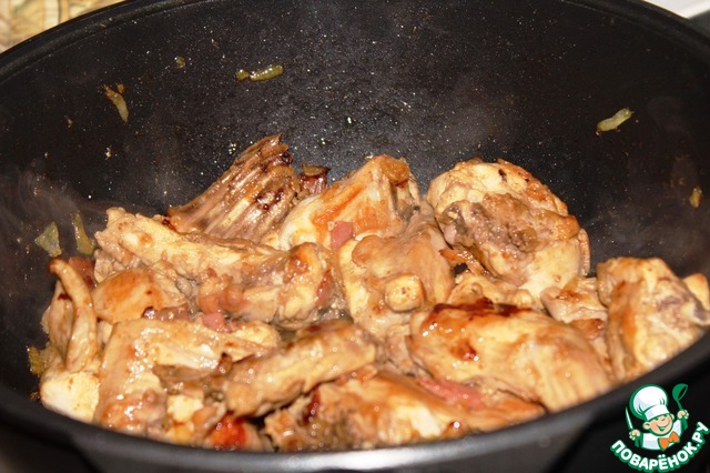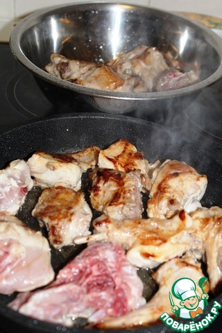 Обжарить куски кролика на сковороде с толстым дном в оливковом масле на сильном огне с двух сторон до образования румяной корочки (я обжаривала порциями).