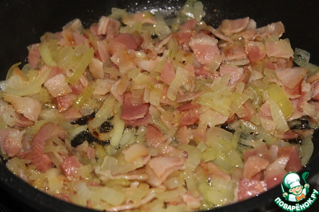 В небольшой сковороде разогреть оливковое масло (1 ст. л.), положить в него лук и бекон и обжарить на среднем огне до золотистого цвета.