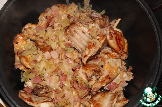 Подготовленные куски кролика переложить в сотейник или кастрюлю с толстым дном, добавить обжаренные лук и бекон и жарить при постоянном помешивании минут 15.