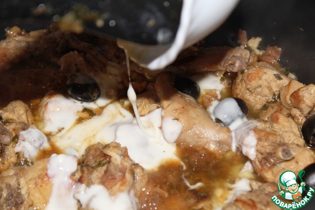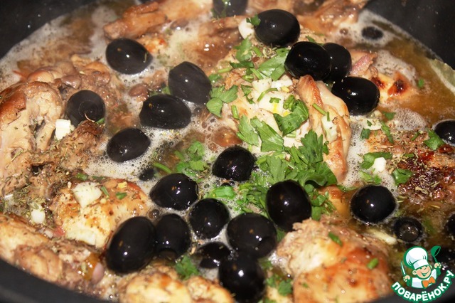 Залить кролика белым вином, разбавленным 100 мл холодной воды. Положить маслины, лавровый лист, чеснок, петрушку и тимьян. Готовить на слабом огне 40 минут, время от времени переворачивая куски кролика.