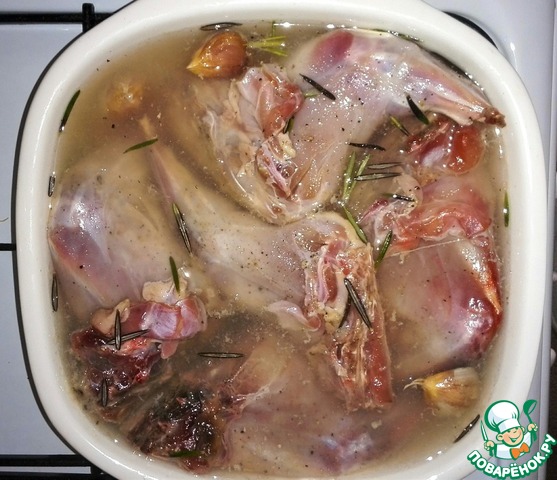 Подобрать кастрюлю/глубокую сковородку/глубокую керамическую форму такого размера, чтобы все куски крольчатины уместились на дне в один слой. Тут важен один момент - у ножек есть маленькая торчащая косточка, я у нескольких ножек ее рубанула чтобы уместить и потом пожалела, так как она ваша помощница в дальнейшем. У меня уместились 5 ножек. разогреть вашу кастрюлю, на дно плеснуть оливкового масла, выложить кролика, добавить соль, перец (я лично кролика равномерно натерла), положить чеснок неочищенными зубчиками!! и 2 веточки розмарина. Все это залить бульоном и вином. Варить при слабом кипении 40-60 минут под крышкой, ориентир - чтобы мясо начало хорошо отделяться от кости без тянучести. У меня время было 65 мин.