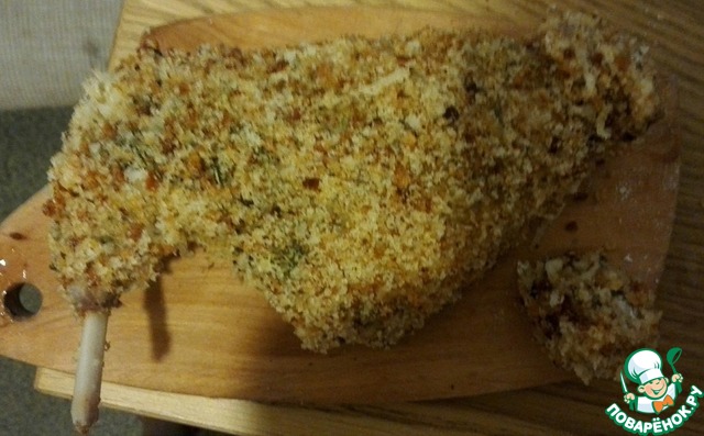 Обваляйте кусочки кролика в муке равномерно, затем в яйце также равномерно. Дайте стечь лишнему. Затем посыпьте пармезаном и тимьяном, а потом обваляйте с получившейся панировочной крошке. И так каждый кусочек, затем сложите все на блюдо или доску и отправьте в холодильник на некоторое время (у меня он там полежал не больше часа, но около того). Кстати на этом фото видна ваша помощница косточка, которая очень выручит в этом обваливательно-обмак ательном процессе. Тут важен еще момент, если не спешить и не путать последовательность - получится все супер! Кусочки чеснока необходимо также достать, обсушить и в той же последовательности обвалять и отправить в холод.