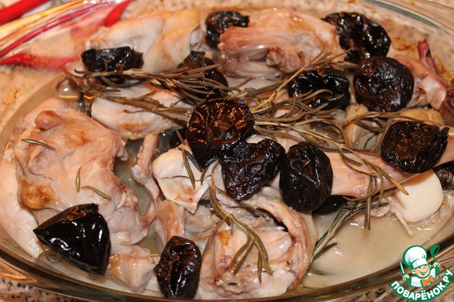Итак, у меня был кролик весом чуть более килограмма. Его мы разделываем на кусочки. В оригинальном рецепте крол запекался целиком, а брюшко его начинялось черносливом. Я считаю, что разделать лучше до запекания - и подавать проще, и кусочки равномерно пропитаются всеми ароматами.
