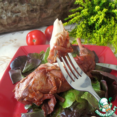 В соус добавить мясо кролика, кокотницу закрыть крышкой и поставить в духовку на 1,5-2 часа. Важно, чтобы крышка прилегала плотно, иначе соус выкипит.
