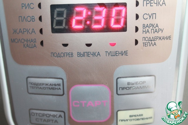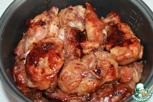 Обжаренного кролика перекладываем в чашу мультиварки. Туда же отправляем карамель образовавшуюся при жарке. Кроме того, в посуде в которой мариновался кролик будут также остатки маринада в который мы добавляем чуть чуть воды и также отправяем в чашу. По необходимости досаливаем.