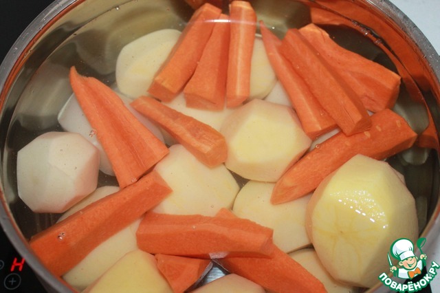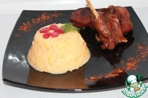 На гарнир предлагаю очень вкусное картофельное пюре, которое я готовлю с добавлением большого количества моркови при варке. А потом с помощью блендера пюрирую с добавлением сливочного масла и молока. Морковь дает прекрасный вкус и цвет.