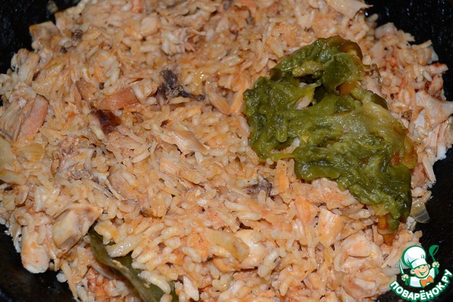 С пропотевшего перца снять кожицу, мякоть промокнуть бумажным полотенцем, нарезать небольшими кусочками и добавить в паэлью.