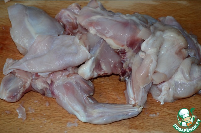 Тушку кролика вымыть, обсушить и разрезать на куски. Кролика я взяла не всего, а чуть меньше половины.